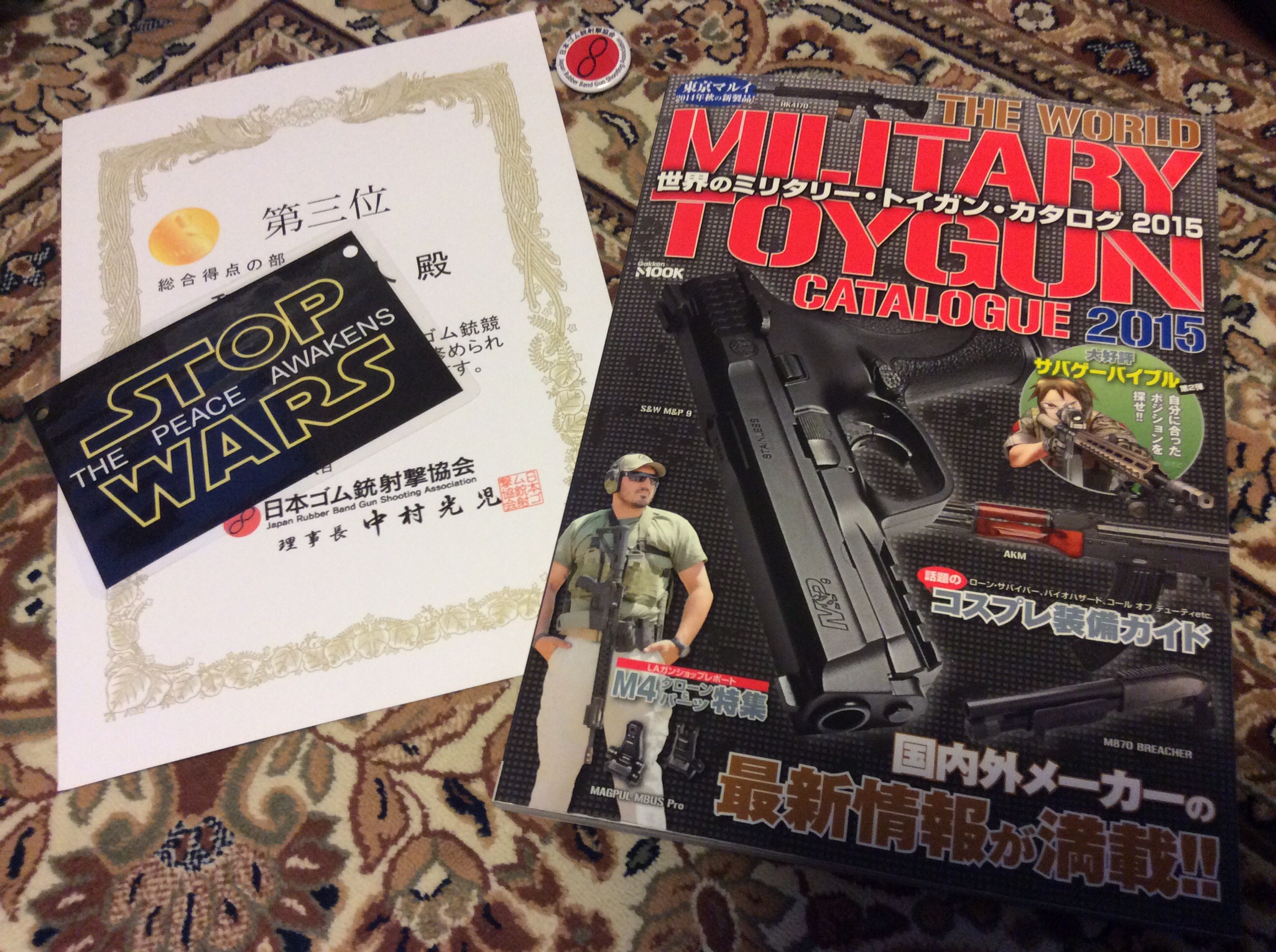 反省はここまでとして賞品としていただいたのは、モデルガンのカタログ、平和を訴えるストラップ(?)、協会缶バッジなどです。